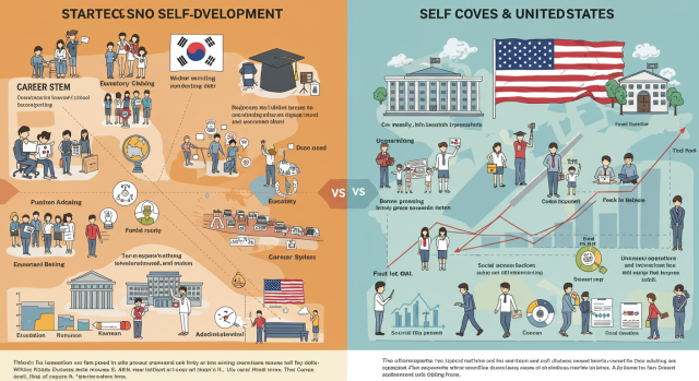 한국은 사회적 기준(스펙, 승진, 안정적인 직장)에 맞춘 자기계발을 중시하지만, 미국은 개인의 목표와 관심사를 중심으로 성장합니다.