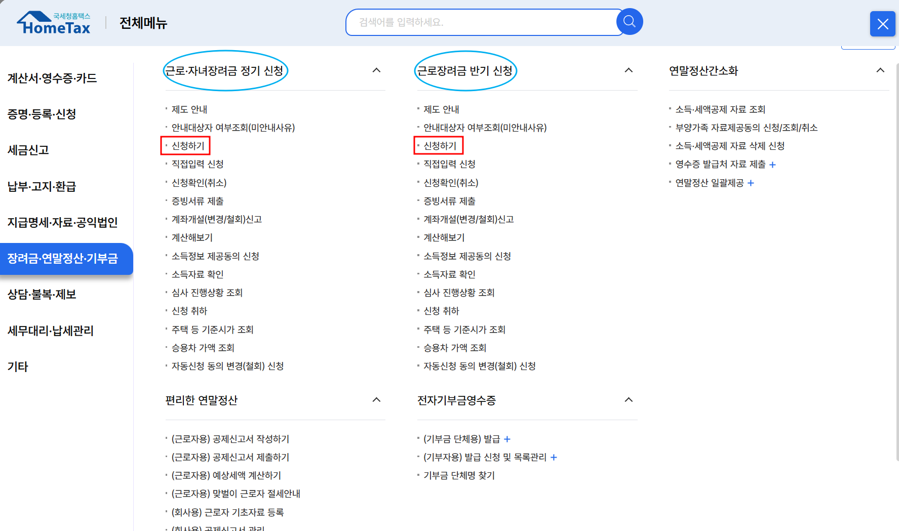 - 국세청 홈택스 접속 후 오른쪽 상단 전체 메뉴 클릭